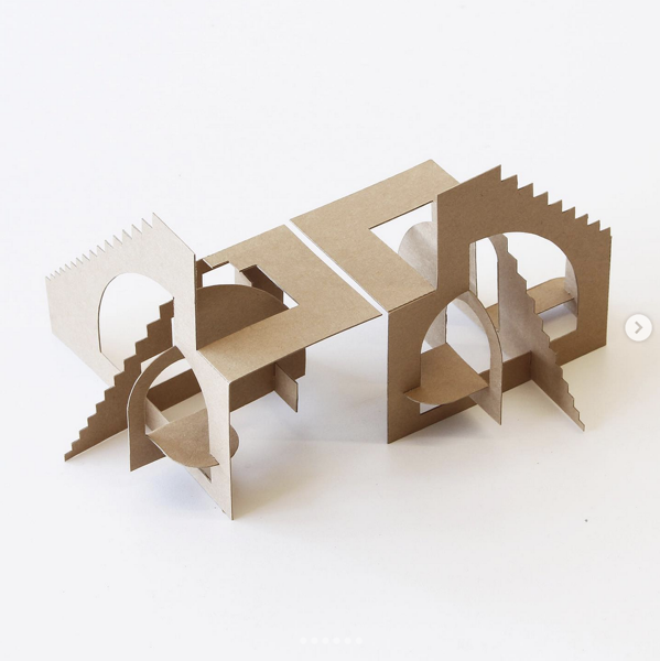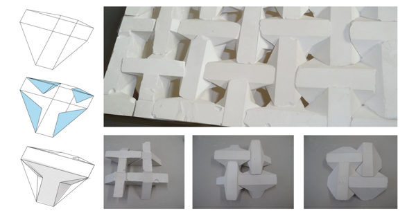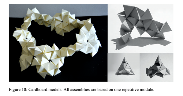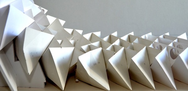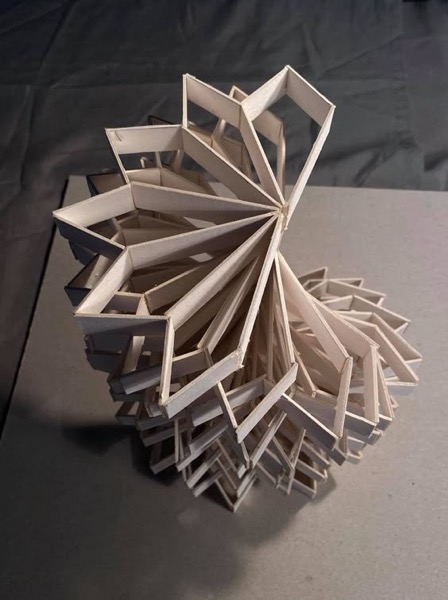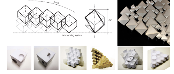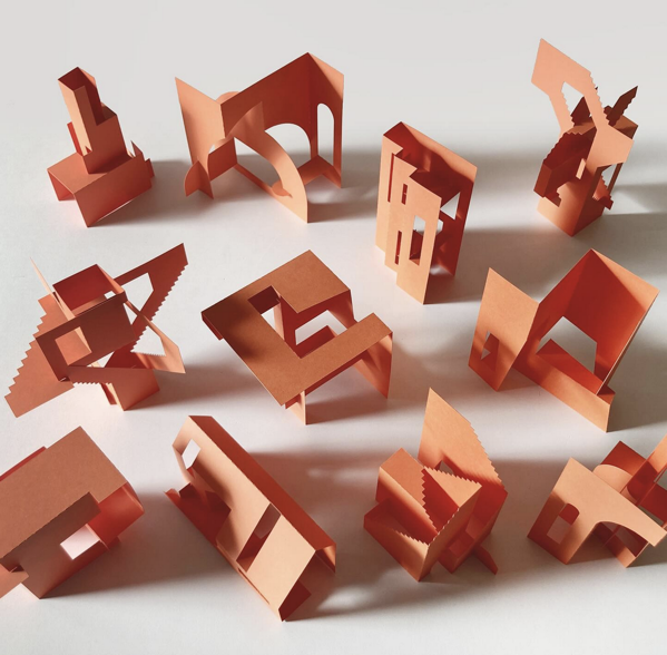 Create a folded planar module and repeat it to build a complex spatial structure. The final form should imply a different volume or figure than the individual unit, emerging through repetition, orientation, and aggregation.
